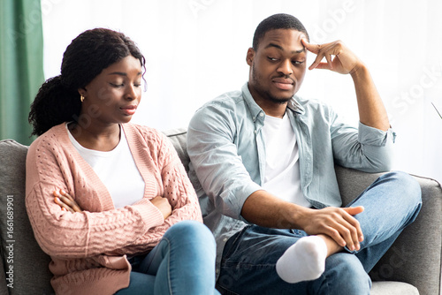 Frustrated black woman sitting apart from her pensive boyfriend, young african american couple having fight at home, suffering from difficulties in relationships during coronavirus self-isolation