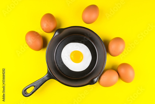 Frying pan with fried egg isolated on a yellow background viewed from above.