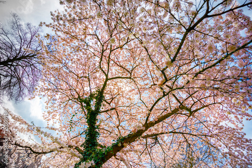 Full bloom cherry blossoms fill the sky, viewed from below. Springtime beauty.
