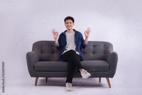 Full body image of young Asian man posing on sofa on white background