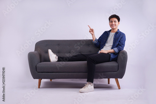 Full body image of young Asian man posing on sofa on white background