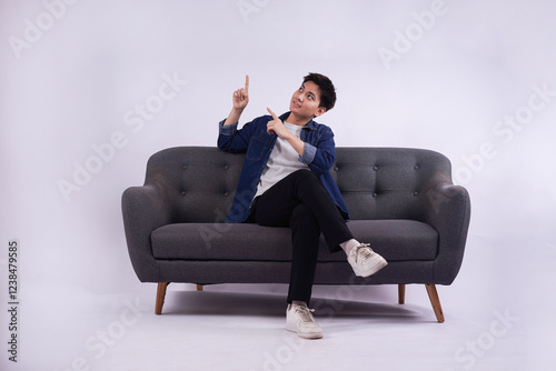 studio, young, happy, enjoy, gesture, chinese, japanese, happiness, casual attire, freelance, advertisement, full body, model, pointing, man, indonesian, rest, sofa, business, relax, asian, malaysian, cheerful, thai, vietnamese, korean, portrait, people, home, lifestyle, emotion, shirt, full-length, background, person, adult, showing, male, sitting, fashion