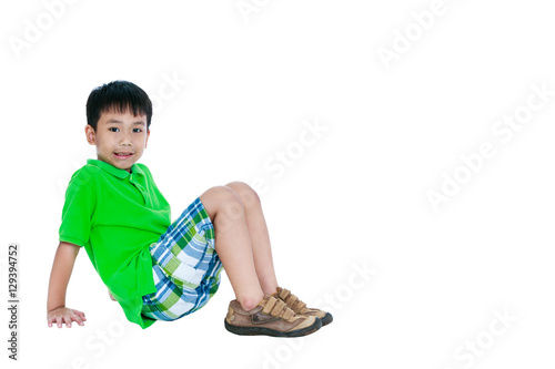 Full body of asian child smiling and looking at camera, isolated on white