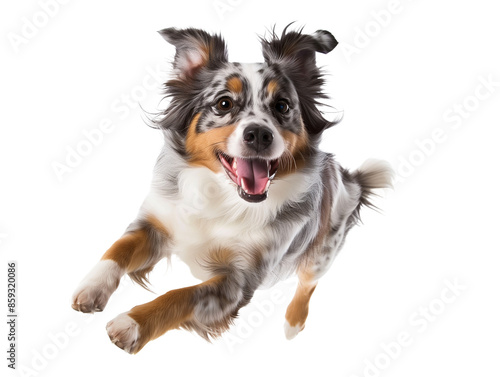 Full body shot of Miniature American Shepherd dog, running happily, smiling.