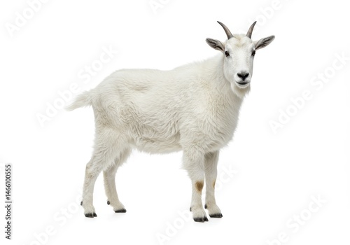 Full body view of a mountain goat with white fur standing on a white background in a studio