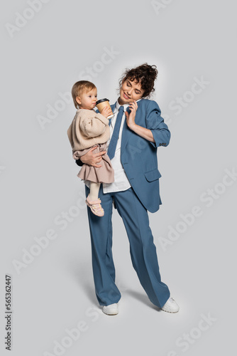 full length of happy businesswoman in suit talking on smartphone while holding toddler daughter with takeaway drink on grey.