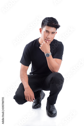 Full length of young asian handsome man sitting over white background