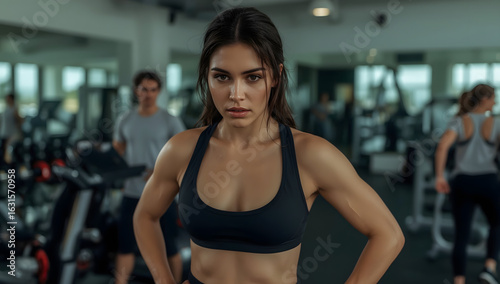 Full length portrait of a fit and toned athletic woman with a determined facial expression and a subtle smile, wearing a sleek black sports bra and leggings, her dark hair tied back in a ponytail