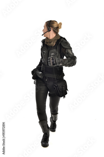 full length portrait of female soldier wearing black tactical armour, isolated on white studio background.