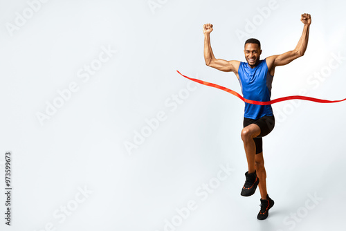 Full length portrait of satisfied young black sportsman celebrating success jumping over yellow studio background