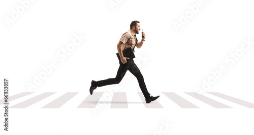 Full length profile shot of a security guard running at a pedestrian crossing and using a walkie talkie