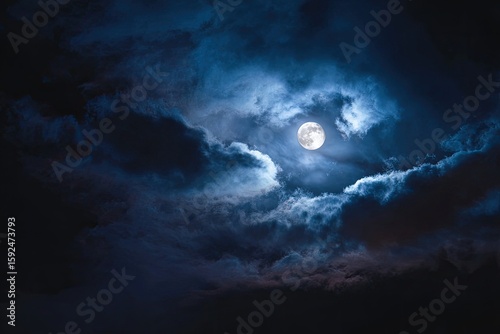 Full moon behind dark clouds at night