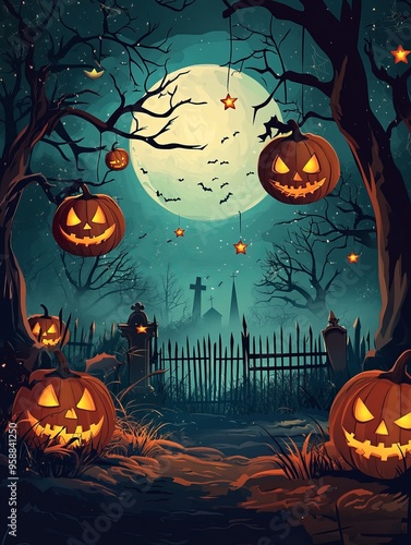 Full Moon Halloween Night with Spooky Forest and Pumpkin Heads