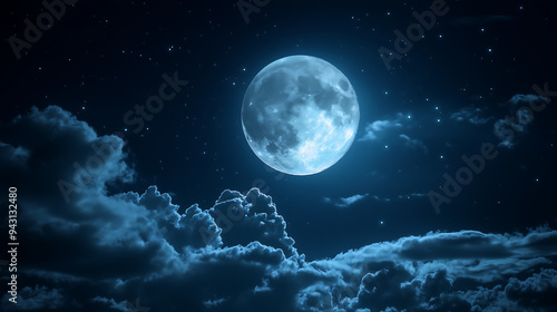 full moon shining brightly in the night sky, surrounded by clouds and stars