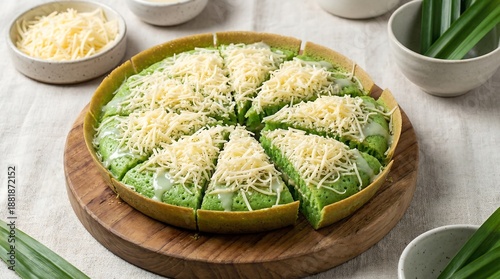 Full-layer pandan martabak served open-faced and sliced into multiple portions.