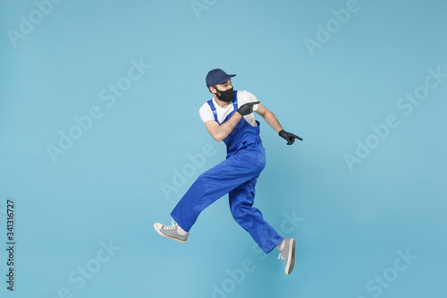 Fun jumping delivery man in cap t-shirt uniform sterile face mask glove isolated on blue background studio Guy employee courier Service quarantine pandemic coronavirus virus covid-19 2019-ncov concept
