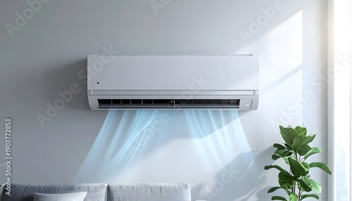 Functional white household air conditioning hardware creates a realistic shadow gradient during a quiet morning in a studio