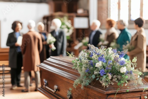 Funeral gathering with diverse mature adults and floral-covered coffin in church setting