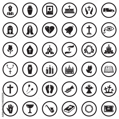 Funeral Icons. Black Flat Design In Circle. Vector Illustration.