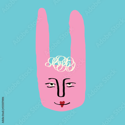 Funky rabbit with a lovely face. Freaky comic rabbit face. Bizarre Valentine's Day Card in modern doodle style. Vector illustration