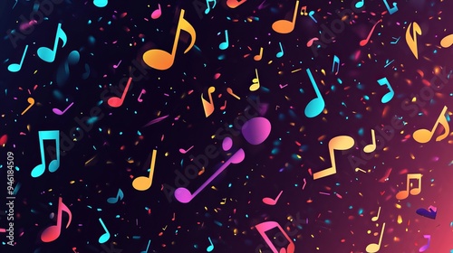 "Funky vector art wallpaper featuring a dynamic scatter of musical note icons and symphony notation signs, creating a vibrant dance music concept with artistic silhouettes and pause symbols, ideal for