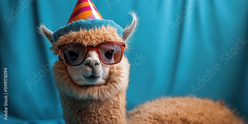 Funny alpaca wearing party hat, sunglasses. Animal looks happy, festive against blue backdrop. Photo suitable for greeting card party celebration design. Perfect for birthday cards New Year Eve party