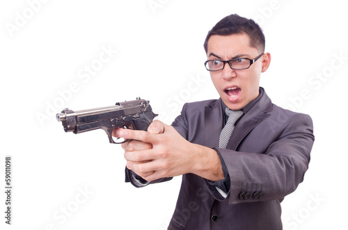 Funny businessman with gun on white