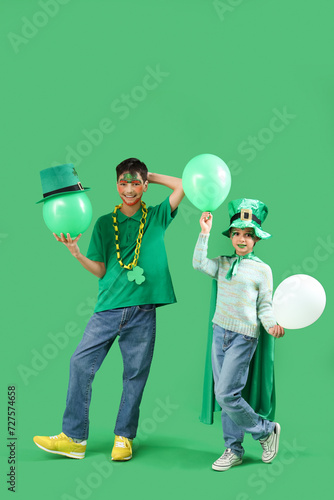 Funny kids with face paintings, costumes and balloons on green background. St. Patrick's Day celebration