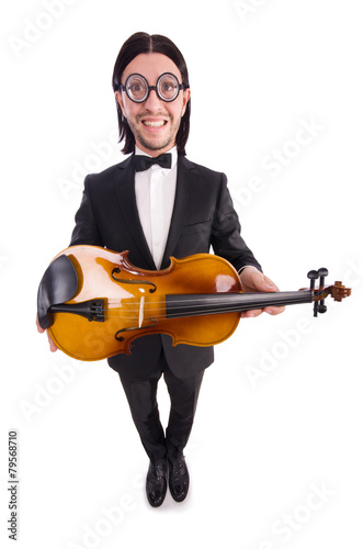 Funny man with violin isolated on white