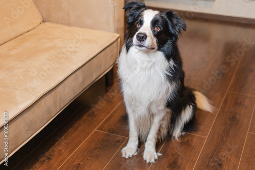 Funny portrait cute puppy dog border collie indoor. Pet dog resting at home. Puppy dog indoors in domestic room. Funny emotional dog having playful mood. Love for pets friendship companion pet care