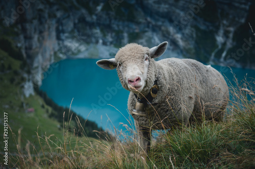 funny portrait of a sheep on the steep slopes high above Oeschinensee near Kandersteg