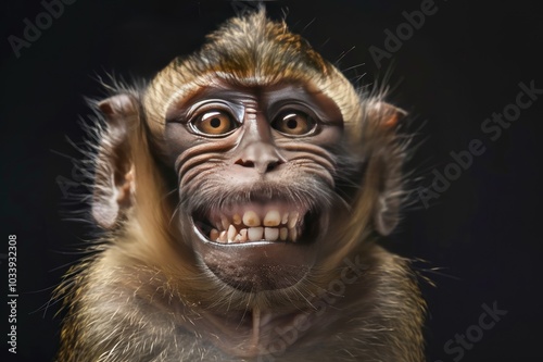 Funny Portrait of Smiling Barbary Macaque Monkey, showing teeth Isolated on Black Background