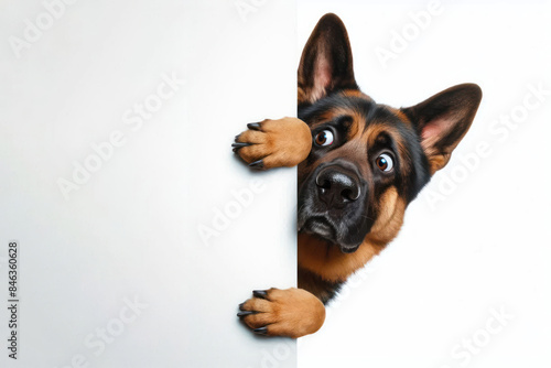 Funny surprised dog peeks out from around the corner Isolated on white background