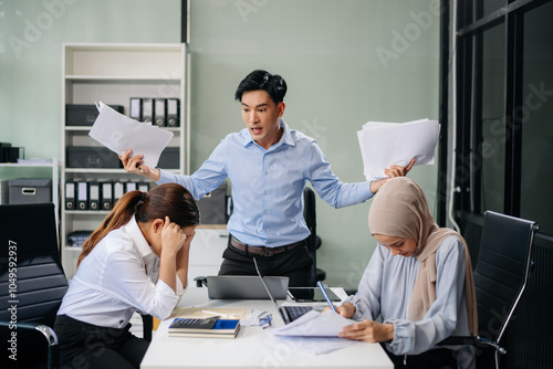Furious team Asian businesspeople arguing strongly after making a mistake at work in office
