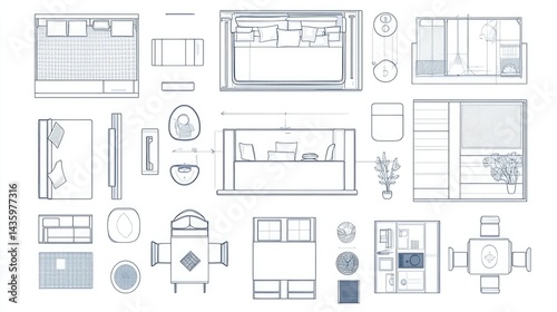 Furniture outline top view. Set of isolated linear icons for interior. Vector objects and elements for office, apartments, living room, bedroom, kitchen, bathroom. Bed, sofa, table. Floor plan.