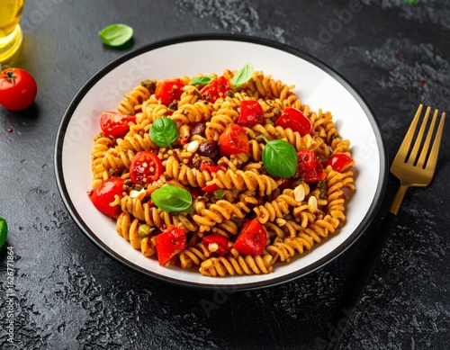 Fusilli pasta with olive oil, tomatoes and basil