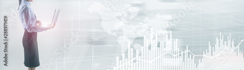 Future Financial Technology Interface. Graph Stock Market chart. World map on virtual screen. Website Banner.