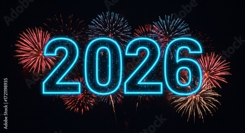Futuristic 2026 Year Display with Binary Code and Festive Fireworks on Dark Sky