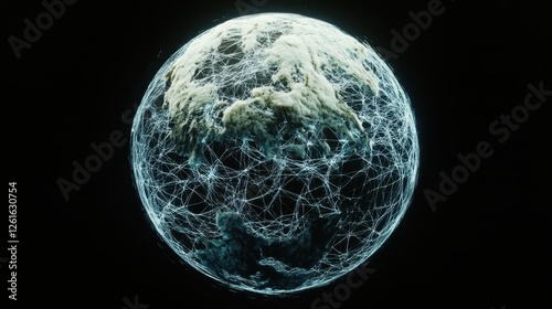 Futuristic 3D Earth with pulsing white and blue networks, showcasing global internet connections and information exchange.