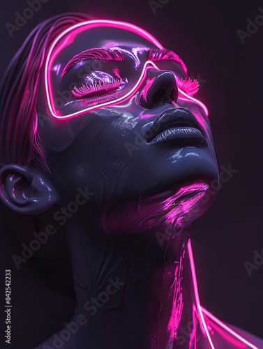 Futuristic 3D-render of a woman with neon lights on her face, wearing glasses. Dark background, cyberpunk theme, close-up.