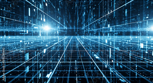 Futuristic Abstract Digital Technology Network Grid with Glowing Blue Neon Circuitry Connection Lines and Cyberpunk Matrix Data Visualization Design