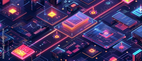 Futuristic abstract technology background with neon lights and intricate circuit board design.