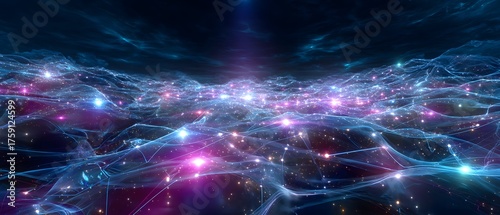Futuristic AI neural network background with a colossal holographic brain lattice of glowing cyan and magenta nodes, particle flow and metallic light for technology, innovation and science.