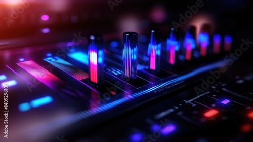 Futuristic audio mixer in dark studio, illuminated by vibrant color