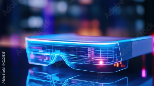 Futuristic augmented reality glasses on a sleek surface with vibrant neon lights in the background