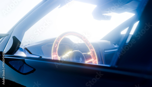 Futuristic autonomous car interior illuminated with digital steering wheel