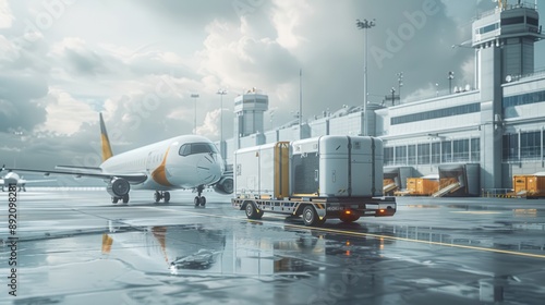 Futuristic Autonomous Cargo Aircraft Unloading at Advanced Logistics Terminal - 3D Render Concept in Next-Gen Air Freight Industry, Generative Ai