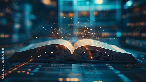 Futuristic Book with Digital Data Streams, An open book with glowing digital data streams emerging from its pages