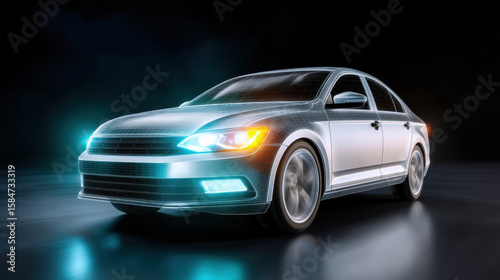 Futuristic car with digital overlay, glowing lights, and sleek design on dark background. image conveys innovation and technology