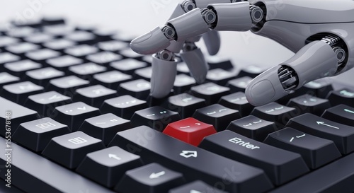 Futuristic chrome robot hand interacts with a keyboard featuring vibrant, defined keys, symbolizing artificial intelligence, technological progress, and digital innovation.